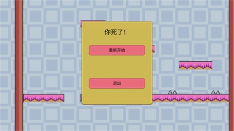4、连续点击两次跳跃键就能实现二段跳。游戏里存在不少诸如地刺之类的陷阱,玩家一旦碰到就会死亡,届时需选择重新开始或者退出游戏。
